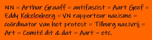 'Toegevoegd 25/07: deel 2, Arthur Graaff') Aart Aart Geef AG Anime4e antifascist Art Arthur Egon Graff bekendste antifascist van Nederland bestuurslid NVJ Comité Vorden Fout? Coörd. Herdenk nazis niet / coördinator NLnazivrij.tk coördinator van de protestactie Eddy Kokelenberg Groep historici en betrokkenen oorlogsauteur nazaten van het verzet en historici nn NL nazi vrij VN rapporteur nazisme voorman van de AFVN Webnetprof Werkgroep Herdenk nazi's niet Werkgroep Tilburg nazivrij! Naamsvarianten (door Arthur Graaff