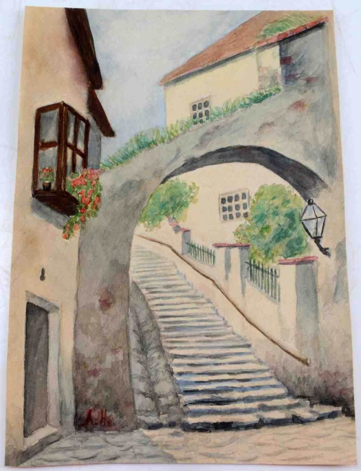 Description by auctioneer: "This 12cm x 17cm painting of Pre German WWII town features archway scene, titled Altes Gastchen was painted during the Vienna Period, the watercolor painting is signed "A.H." for Adolf Hitler. No COA but deemed authentic as pre auction terms." Comment by Droog