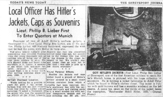 enlarge. Lieber's “Hitler collection” was stolen in 1968 by his chauffeur, who sold the material to the New York Militaria dealer Peter Hlinka, who resold it Raymond Zyla of Mohawk Arms Inc. In 1970 Lieber sued the dealers for the return of his goods. In the court case his collection was described as “it included Hitler's uniform jacket and cap and some of his decorations and personal jewelry.” Lieber won the case. According to Wilbur C. Stump, in 2014: “Before returning the collection, Raymond Zyla and his brother Joseph called on Lieber's New York lawyer Charles Drake and offered what Raymond Zyla described in a 1985 deposition as "a large amount of cash". The offer was accepted and the collection remained in Mohawk Arms' possession.”