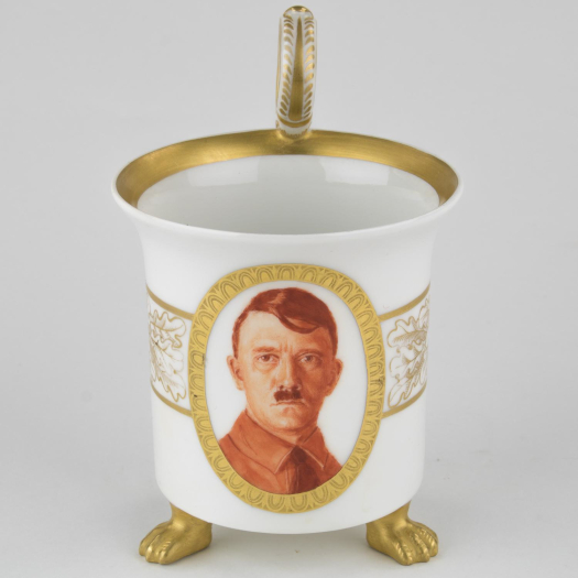 Description by auctioneer: "An extraordinary relic with un-shakable provenance, a porcelain shaving mug bearing Adolf Hitler's portrait, owned and used by Hitler at his Munich apartment and taken as 'spoils of war' by Jewish American Army officer Lt. Ben Lieber. The mug, marked by distinguished makers K.P.M., stands 5.5 inches tall overall, resting on three gilt 'feet'. A 1.25 inch band of gold oak leaves encircles the piece, meeting at the front at a 2.75 inch tall oval portrait of Adolf Hitler in Brownshirt dress. The portrait, surrounded by gold trim, is brilliantly executed and of the best quality. The mug rises to a flared top rim 3 5/8 inches wide and trimmed in gold. At the rear of the mug is an ornate handler with lavish gold trim painted on the sides and on the edge of the handle. The bottom of the mug displays the K.P.M. maker's mark, with hand-painted 'Heil Hitler!', also 'Juliann Koch geb Krog.' (the artist) and the year '1932'. The rear foot of the mug bears a tiny chip, touched-up with gilt paint, otherwise the piece is in as-new condition. This piece has sterling provenance. On or about April 30, 1945 Lt. Philip Ben Lieber of the 692nd Tank Destroyer Battalion was one of the first soldiers to enter the private Munich apartment of Adolf Hitler at Prinzregentenplatz 16. He seized the best 'souvenirs' he could find, including Hitler's visor cap and Nazi 'brown shirt', his 'Blood Order' and other medals, a portrait of Hitler's mother...and this shaving mug, among other items. Lieber's discovery was heralded in newspapers at the time, and was examined by respected dealer Ben Swearingen III. Lieber specifically mentions the shaving mug in a 1967 letter to collector David Mathes, who bought the mug in 1969. The piece is again mentioned in a notarized letter from Lieber's wife to Mathes in 1972, probably for purposes of resale. In the meantime, in 1970, the balance of Lieber's collection was purchased by Mohawk Arms and then resold to dealers Wolfe-Hardin in 1994. At some point prior to 2014, Wolfe-Hardin also purchased the items in the Mathes collection. In 2014, Wolfe-Hardin sold the Lieber