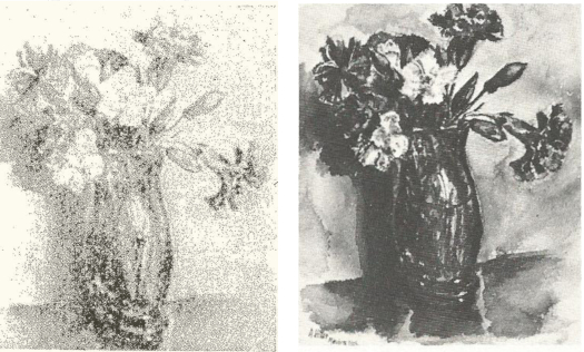 Again, this is quite startling information. If the year mentioned in The Times, "1912", is correct, then apparently neither Charles Hamilton nor "art expert" Peter Jahn knew that it branded the watercolor as a forgery - for Hitler emigrated to Munich in May 1913! ![]() Black and white reproductions of the auctioned work, in The Times (left) and in Price (right). But maybe the "1912" in The Times article is a typo. For in the book Adolf Hitler als Maler und Zeichner (a.k.a. as Price or Werkkatalog), compiled by Jahn and August Priesack, this work is depicted too, as # 302, with as description "Signed and dated "A. Hitler, München 1913"". Unfortunately, neither on the photo published in The Times, nor on the one in Price the year can be seen. Now, "art expert" Peter Jahn was a professional swindler, already before the Second World War involved in the trade of fake Hitlers. As he stated in 1978 that he never had seen a Hitler flower still life before, then the 1978 still life must have boosted the production of similar works, as in Price a great number of still lifes are depicted. And how about Charles Hamilton? He was an autograph expert, for handwritten autographs. He was definitely not an art expert, ignorant of the fact that painted signatures are very easy to forge. Drs. P.L. Zevenbergen, Chief Constable (retired) of the The Hague Police, handwriting expert, formerly working for the 'Judicial Laboratory Rijswijk' (the forerunner of the Netherlands Forensic Institute) and involved in the investigation of the falsified Hitler diaries in 1983, stated that a signature on a watercolor is not suitable for identification purposes, for several reasons, remarked about signatures on painted works: