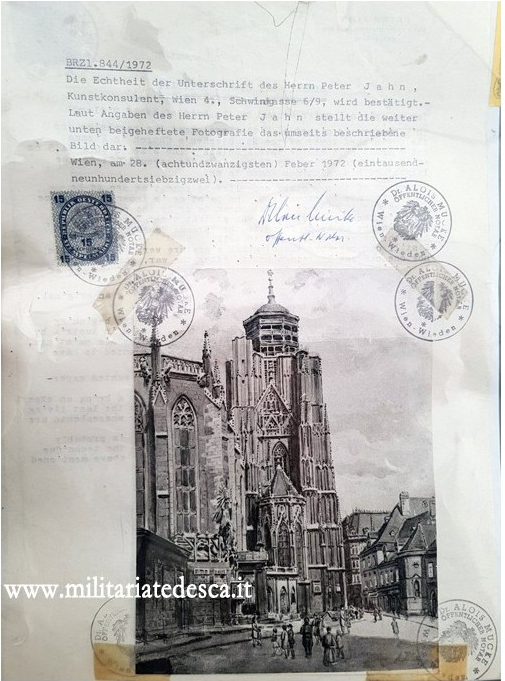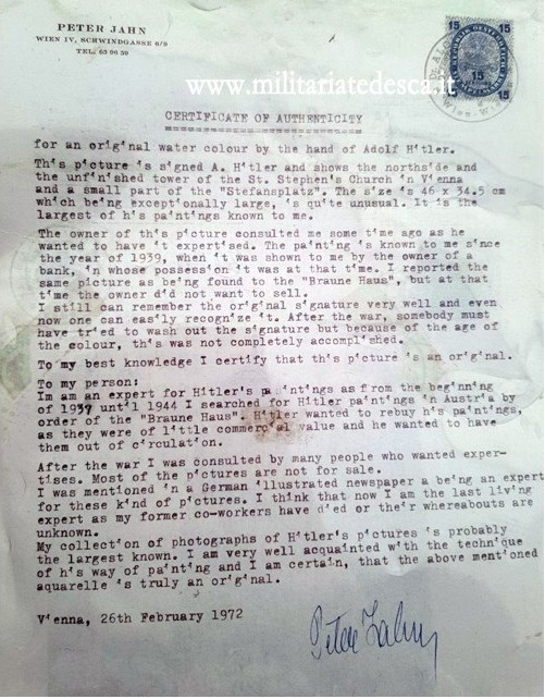 "Huy Hitlers" auctioned by Jefferys (UK) In September 2006 Jefferys (Lostwithiel, Cornwall) auctioned twenty-one watercolors and drawings allegedly made by Adolf Hitler. The auctioneers stated that the works were “probably made by Hitler”and that in their opinion the signatures were authentic. The works sold for £118,000 (€176,000). Needles to say: all works were obvious fakes. See: The Huy Hitlers. to top of page. Fake Hitler surfaces at Germania International (US) A watercolor titled "Wien Stephansdom" (Stephen's Church, Vienna) allegedly painted by Adolf Hitler in 1910-1912, is offered on the site of Germania International, an US based Militaria dealer. ![]() ![]() It's a clear fake: the figures on it are too well painted to be made by Hitler and the Hitler signature on it is an obvious (and very bad) forgery. The work is accompanied by an Certificate of Authenticity issued by the notorious Austrian swindler Peter Jahn, on February 26, 1972, in English.