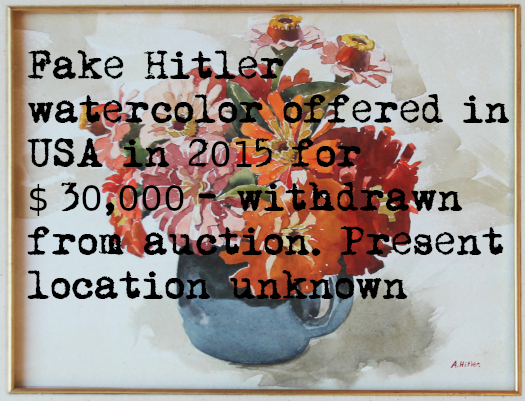 ![]() Left the alleged Morgenstern stamp print in Price; right the stamp print on the back of the 2015 "Hitler". They are made with the same stamp. We haven't traced a CoA issued by Peter Jahn to this work yet. Statement by Jakob Altenberg. Oberpolizeirat Dr. Spring. Bundes Polizeidirektion Wien, Sicherheitsbureau, s.B. 17105/36, November-December 1936. NSDAP Hauptarchiv NS 26/2599; Bundesarchiv Berlin. Ginger Adams Otis. Adolf Hitler’s painting of flowers goes on auction block New York Daily News, 23-03-2015.http://www.nydailynews.com/news/national/adolf-hitler-painting-flowers-auction-block-article-1.2159511 David Ng. Purported Adolf Hitler watercolor painting to be sold at auction. Los Angeles Times, 24-03-2015. http://www.latimes.com/entertainment/arts/culture/la-et-cm-adolf-hitler-painting-auction-20150324-story.html Hitler Flower Painting Could Exceed $30,000 At Auction. Artlyst.com, 25-03-2015 http://www.artlyst.com/news/hitler-flower-painting-could-exceed-30000-at-auction/ Danielle Haynes. LA auction house withdraws watercolor said to be by Hitler. UPI, 25-03-2015. https://www.upi.com/Top_News/US/2015/03/25/LA-auction-house-withdraws-watercolor-said-to-be-by-Hitler/2991427321086/ Lot 8, veiling 26 maart 2015. Veilinghuis Nate D. Sanders (via Internet Archive) https://web.archive.org/web/20150317233642/http://natedsanders.com:80/Adolf _Hitler_Watercolor_Painting____During_His_Yea-LOT35911.aspx 2015 - 'Hitler' in Malaga Op 28 maart 2015 wordt in het Spaanse Malaga bij 'International Autograph Auctions Europe, S.L.' een 'Hitler' geveild. Met dit verkoop-praatje: "An original 10.5 x 14 watercolour painting, purported to be by Adolf Hitler, unsigned, the image depicting a clock tower, with various trees in the foreground. Annotated in contemporary pencil to the verso, in German, Stift bei Wels 18 Februar 1921 Adolf Hitler, indicating that the subject of the painting is the Wels Abbey in Austria." (...) "Provenance: According to information supplied by the vendor, all of which is documented in various newspaper articles (copies of which are included with the lot) the present painting was gifted by Hitler to Herman Goering. It was later to come into the possession of former Luftwaffe pilot Karol Bachraty (father of the vendor) following his escape from a Russian Concentration Camp in 1945. Bachraty made his way to Italy, accompanied by other Third Reich officers. Bachraty was to spend the rest of his life in Chile where he encountered other former officers and together they formed a small association. Bachraty was elected with the chief responsibility of taking care of the paintings, some of which the colleagues intended to sell in order to fund a care home for former officers." Een zoektocht naar 'Karol Bachraty' leidt naar een Spaanstalig blogstuk uit 2005, waar een hoogst onwaarschijnlijk verhaal wordt opgehangen over de Tsjechische piloot 'Karol Anton Bachraty Von Walzer' die met nog eens duizend andere Tsjechische piloten zou zijn overgelopen naar de Luftwaffe. Hij zou van 1940(?) -1943 aan het Oostfront hebben gevlogen, daarna zes maanden in Afrika - nog vreemder, want op 13 mei 1943 gaven de laatste Duitse troepen in Afrika zich over. Wat daarna verteld wordt is zo mogelijk nog onwaarschijnlijker. Het hele verhaal lijkt vooral verzonnen om een partij vervalst Hitler-materiaal en allerhande andere vervalste nazi-militaria te verkopen. D2. La increíble historia de un piloto alemán. Made in Iquique. 23-08-2005 http://madeiniquique.blogspot.nl/2005/08/la-increble-historia-de-un-piloto.html Lot 1474. : HITLER ADOLF: (1889-1945) Fuhrer of the Third Reich 1934-45. An original 10.5 x 14 watercolour painting, purported to be. Invaluable.com, 28-03-2015. https://www.invaluable.com/auction-lot/hitler-adolf:-1889-1945-fuhrer-of-the-third-rei-1474-c-914477ea18