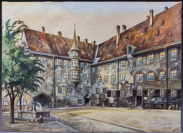 2015 - 2 'Hitler'-aquarellen en 2 tekeningen in München Veilinghuis Hermann Historica biedt op veiling 70r, 12 mei 2015, waar ruim 1300 kavels met voornamelijk Nazi-materiaal (al dan niet echt) worden aangeboden, twee overduidelijke valse Hitleraquarellen en twee vermoedelijk door Albert Speer vervalste 'Hitler'-architectuurschetsen aan. Een van de twee 'Hitlers', Wien - Hoher Markt, 1913. Het andere werk, ongesigneerd en getiteld Weissenkirchen, stamt van Peter Jahn en heeft een Morgenstern-stempel op de achterkant. Zie: 'Het stempel - een nieuwe ontdekking'. Ook wordt een collectie van ruim 200 door kunstzwendelaar Peter Jahn uitgeschreven 'echtheidscerificaten' bij 'Hitlers' aangeboden. De verwachte opbrengstprijs was 1000 euro - onbekend is voor hoeveel euro deze voor vervalsers zeer aantrekkelijke collectie verkocht is. Daarnaast biedt Hermann Historica een groot aantal aan Hitler toegeschreven voorwerpen 'uit de collectie Anni Winter' aan, rijkelijk voorzien van 'echtheidsbewijzen'. Zie: Certificates of Authenticity - Anni Winter. 2015 - the fith Alter Hof? December 6, 2015 Lot 1090 at Thies Militaria Auctions LLC, Kirchheim under Teck, Germany ![]() Click to enlarge. Description by actioneer: “Painting