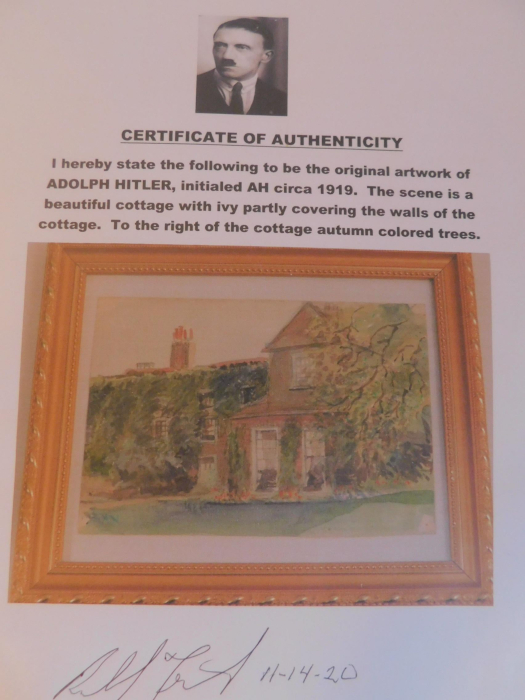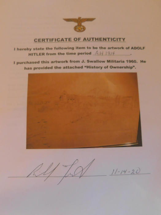 On December 6, 2020 the Reheboth (MA, USA) based Americana Auctions offered two alleged Hitler watercolors, one sketchbook with a number of sketches, and one drawing. All of them were obvious fakes. All were accompanied by fraudulent Certificates of Authenticity, all issued by the same person, and similar to the bogus CoAs accompanying the previous fake Hitlers, sold by the same auction house in October 2020 . Watercolor 1 Watercolor 2 Drawing Text of the Certificates of Authenticity Auction policies Address auction house Lot 0281: