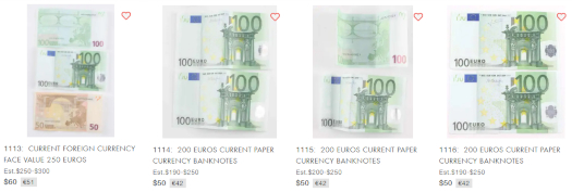 $50 Lot #1115 - 2 x €100 – start bid $50 https://www.liveauctioneers.com/item/100881471_200-euros-current-paper-currency-banknotesLot #1116 - 2 x €100 – start bid $50 https://www.liveauctioneers.com/item/100881472_200-euros-current-paper-currency-banknotes Lot #1117