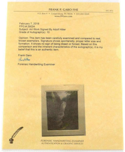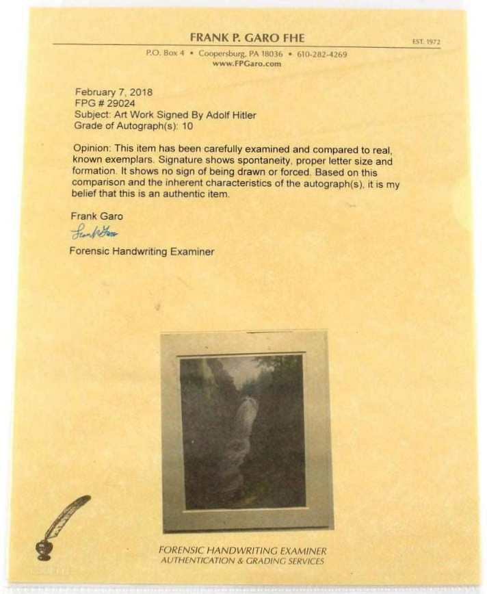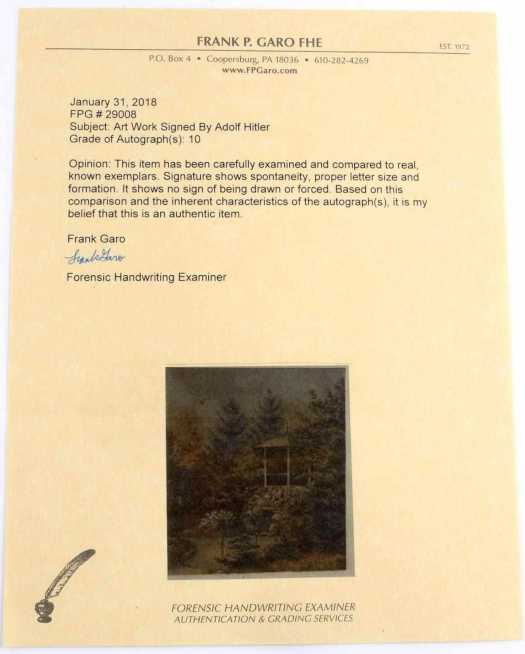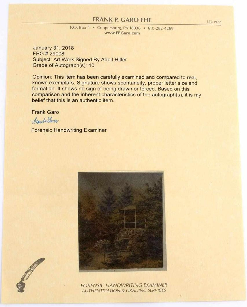 Description by auctioneer: "Adolf Hitler (20 April 1889 – 30 April 1945) Austrian-born German politician, later dictator of Germany from 1933 to 1945. 1911 Vienna Period Aquarelle watercolor painting on card stock, in very good condition. Detailed garden scene with gazebo, signed lower left corner. Garo Certificate of Authenticity dated 1972. Dimensions: 8 1/4 x 7 inches This lot has a reserve."