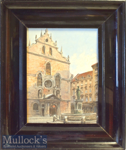 Description by auctioneer: "Attributed Adolf Hitler Artwork within Jacob Altenberg marked Frame with dealer’s label. The watercolour depicts a scene of Franziskaner Church in Vienna with A Hitler to bottom right corner, undated, painting measures 20x26.5cm approx, blank to reverse. Altenberg, an Austrian businessman and picture frame dealer was in regular contact with a young Adolf Hitler in Vienna and bought several of his paintings between 1909-1913. The paintings were used by Altenberg as additions to the more attractive design of the frames he offered which were easier to sell with a filler than when offered blank. This particular painting originally came from a Munich family with a senior member of the NSDAP party and early days SA ‘Sturmabteilung’ in Bavaria. Via inner party contacts, the painting was offered at a time when the Fuhrer was already quite popular within the party but before reaching the ultimate authority over the country. Purportedly, the frame broke after WWII, it made space to hide the paintings signature and has since remained the same. Comments by Droog Magazine: