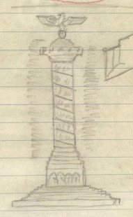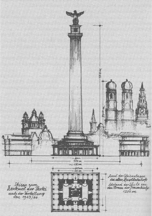 In 1944 Hermann Giesler made this design for a column (Denkmal für die Bewegung / Partei (Memorial for the Nazi party)), which had to be erected in Munich. It was a radical improvement of a model made by Speer based on an amateur sketch by Hitler (which was no more than a copy of a column from Schloss Schönbrunn in Vienna).