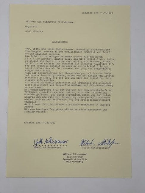 Translation Munich, August 14, 1992 Wilhelm and Margarete Mitlstrasser Geyerstr. 1 8000 Munich We, Gretl and Willi Mitlstrasser, former caretakers of Berghof, make the following statement about the present watercolor of Adolf Hitler: The painting is framed in a contemporary frame measuring 22 x 20 cm. Behind glass, the painting itself, 11.0 x 8.6 cm. It depicts a motif in Vienna, a fountain in the center, a carriage on the left side of the picture and the signature "A.Hitler 09" below. The watercolor is an original painting by Adolf Hitler, which we took with us when we left the Berghof in 1945. After the bombing of Obersalzberg, during which the Berghof was severely damaged, we had a last telephone conversation with Hitler, during which I informed him of the extent of the destruction. At that time we personally received permission and orders to take everything usable from the Berghof and to leave the Berghof. We fled in the direction of Munich in a Mercedes 170, which had been made available to us by the motor pool. We placed most of our belongings with a relative for safekeeping and did not pick them up again until after my release from captivity. Since that time this painting has been in our possession without interruption. Today we pass it on to an acquaintance and collector. [signed et cetera] Questions at letter