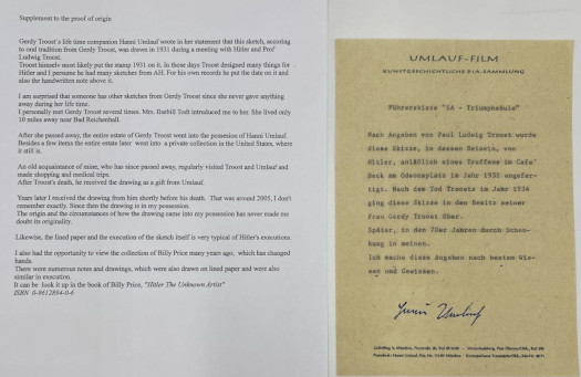 The letter allegedly written by Hanni Umlauf is quite strange. It is a kind of Certificate of Authenticity,in which is stated that she received the sketch as a gift from Gerdy Troost in the 1970s.